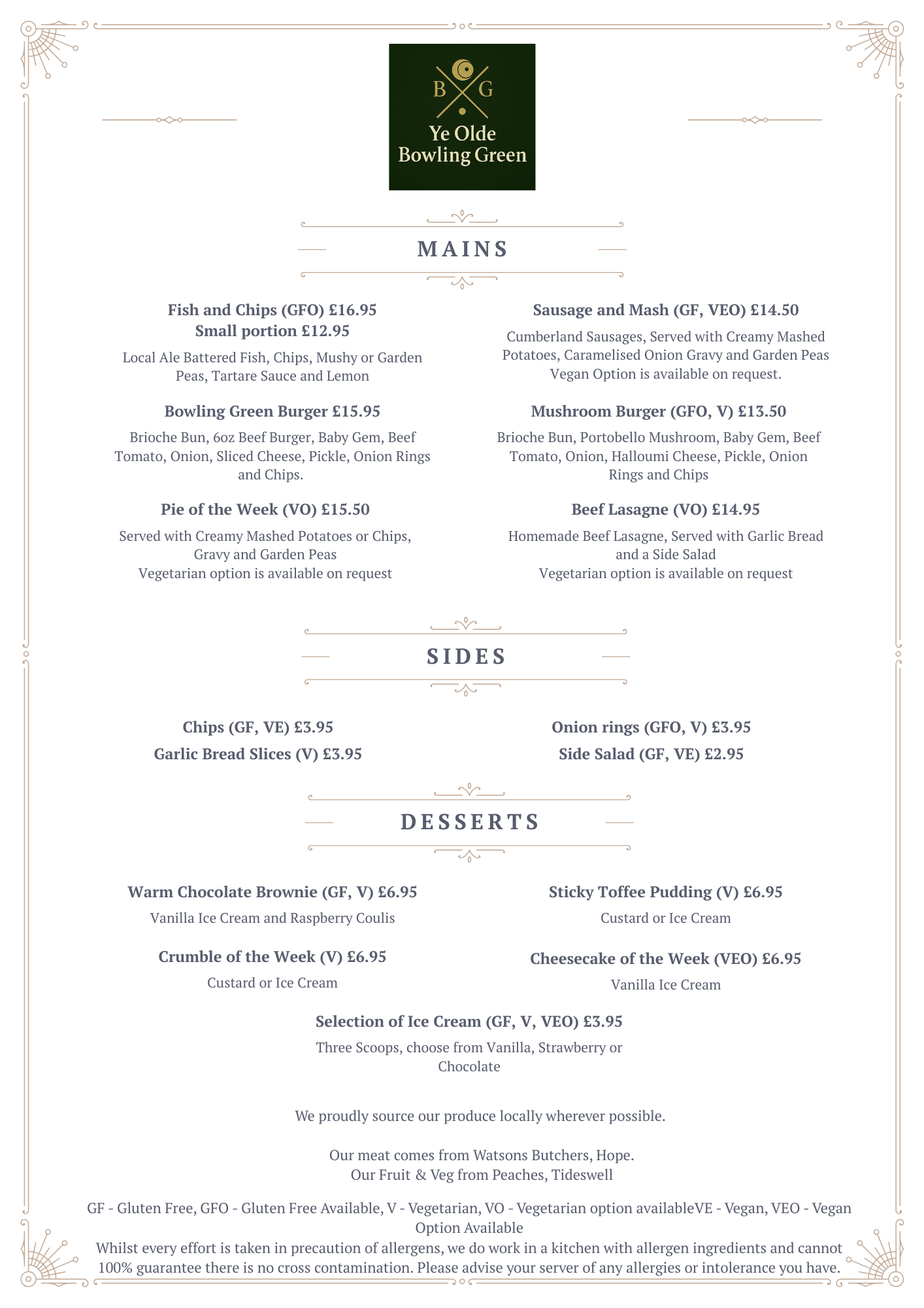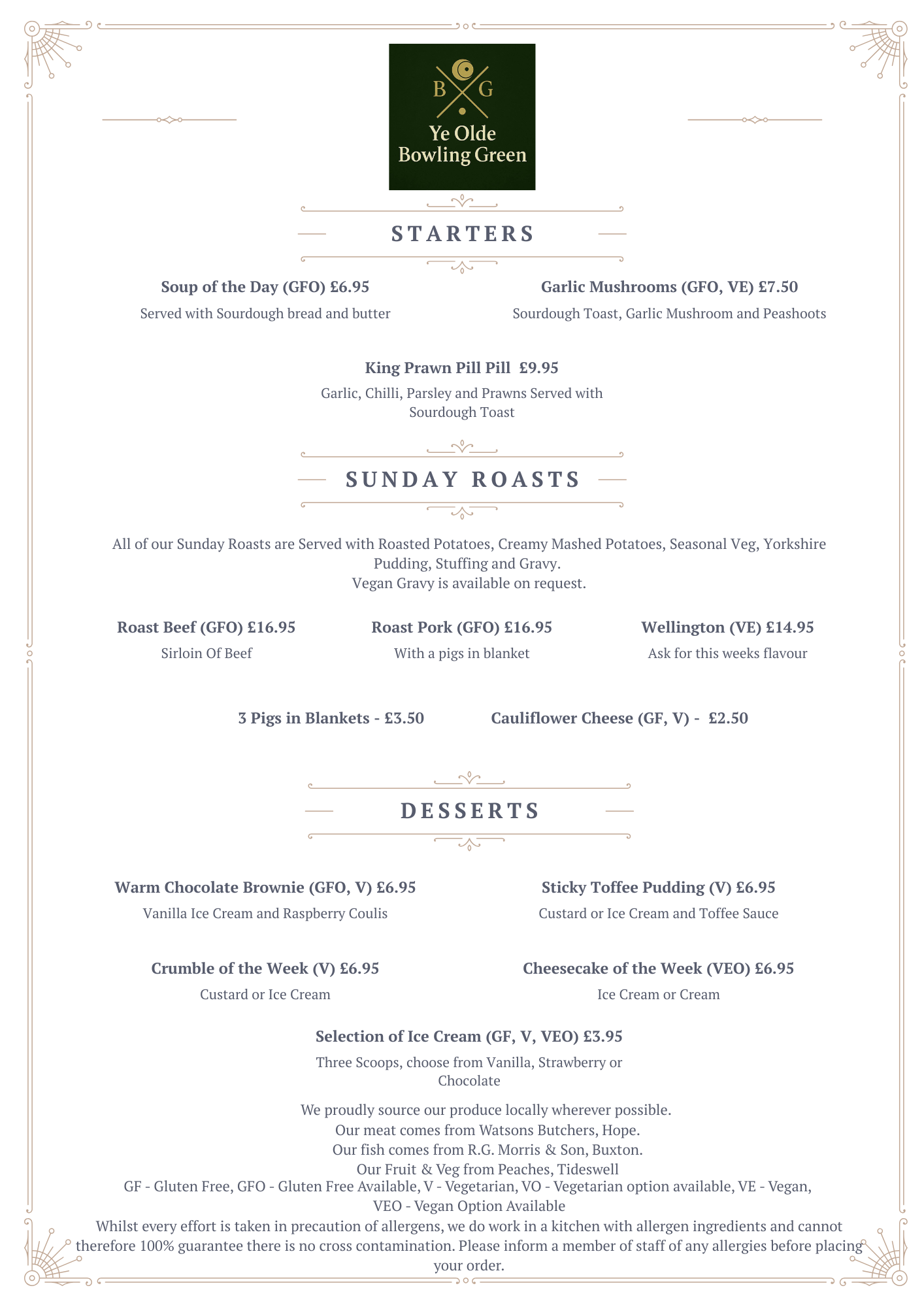 At Ye Olde Bowling Green Inn, we take pride in serving honest, hearty food made with care. Our menu celebrates the best of Derbyshire and the Peak District - using fresh, locally sourced ingredients wherever possible, from trusted regional farmers and suppliers.